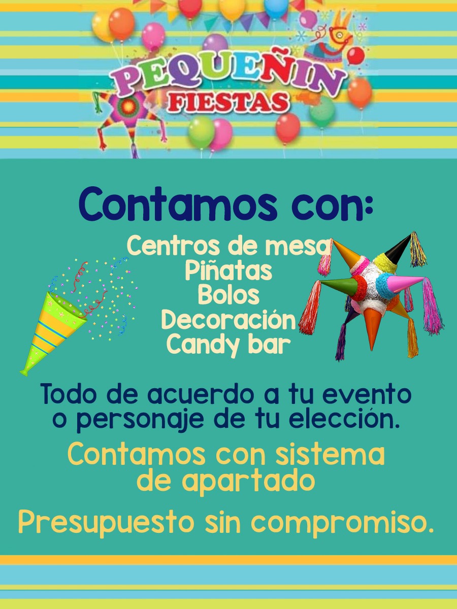 Pequeñin Piñatas empresa dedicada a ponerle vida a tus fiestas, te ofrece centros de mesa, piñatas, bolos, decoracion, candy bar, todo de acuerdo a tu evento o personaje de tu eleccion, contamos con sistema de apartado y presupuesto sin compromiso.