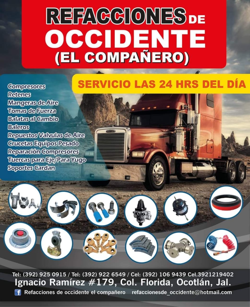 Refacciones de Occidente "El Compañero" te ofrece todo lo que necesites para tu camión o trailer, partes como frenos, refacciones, baterías, válvulas, aceite, compresores, baleros, mangueras, retenes, balatas, rotulas, tuercas para eje, cámaras, soportes, empaques. Teléfono; 3921219402
