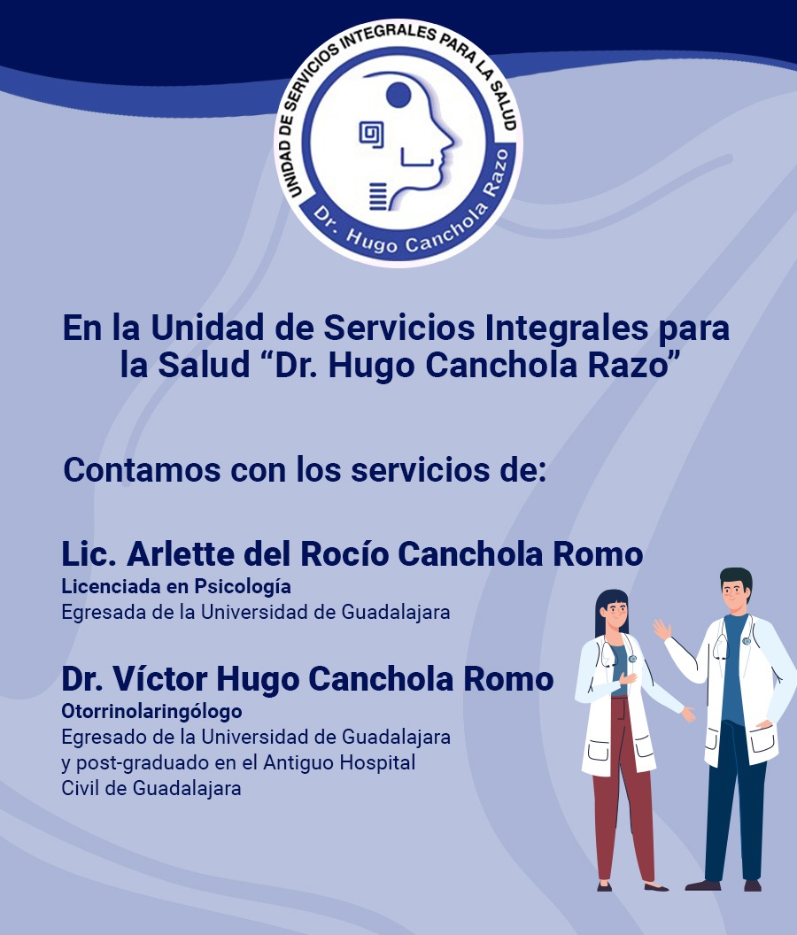 En la Unidad de Servicios Integrales para la Salud “Dr. Hugo Canchola Razo” contamos con los servicios de la Lic. Arlette del Rocío Canchola Romo, Licenciada en Psicología, egresada de la Universidad de Guadalajara, experta en Psicología Clínica, Psicoterapia, Terapia de pareja, Depresión, Trastornos de ansiedad, de conducta, Terapia para adolescentes, etc. Y del Dr. Víctor Hugo Canchola Romo, Otorrinolaringólogo, egresado de la Universidad de Guadalajara y post-graduado en el Antiguo Hospital Civil de Guadalajara, experto en el diagnóstico y tratamiento médico o quirúrgico de diversas enfermedades del Oído (infecciosas, trastornos del equilibrio, sordera) Nariz (infecciosas, alérgicas, sangrados, fracturas, cirugía estética y funcional) y de la Garganta (infecciosas, alérgicas, trastornos de la voz, tumoraciones). Nuestro compromiso es lograr la completa satisfacción de nuestros pacientes en base a una atención médica profesional y humana.