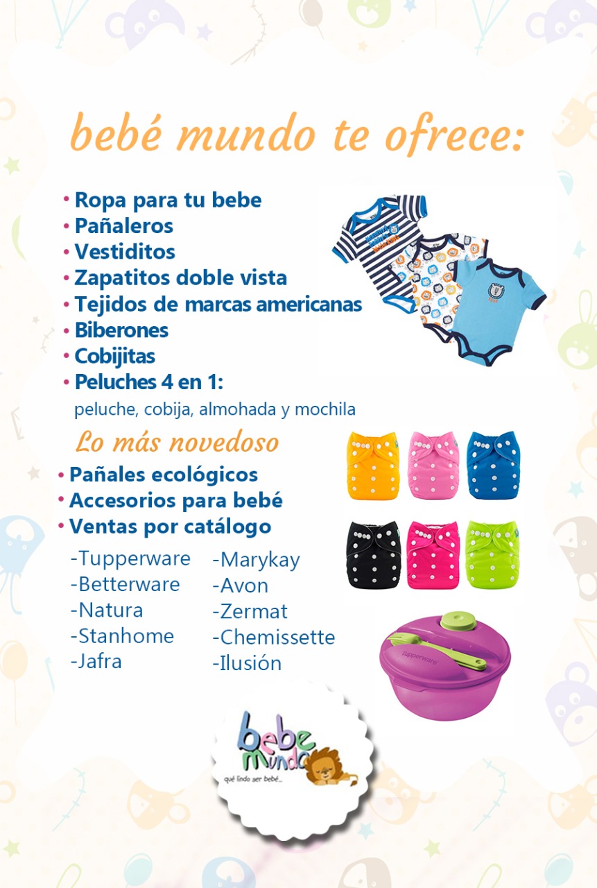 En Bebe Mundo te ofrecemos ropa para tu bebe, pañaleros, vestiditos, Zapatitos doble vista, tejidos de marcas americanas, biberones, cobijitas, peluches 4 en 1: peluche, cobija, almohada y mochila...