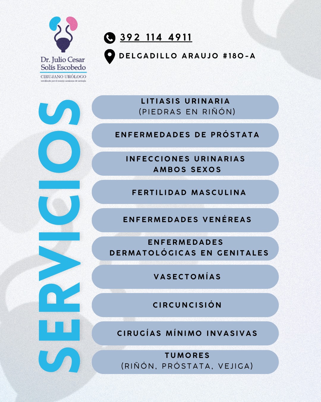 El Dr. Julio Cesar Solís Escobedo Certificado por el Consejo Mexicano de Urologia, se especializa en padecimientos del riñón y sus estructuras adyacentes, las vías urinarias y el aparato genital masculino. Se ocupa del diagnóstico y tratamiento de las enfermedades morfológicas renales y de las del aparato urinario y retroperitoneo que afectan a ambos sexos; así como de las enfermedades del aparato genital masculino, sin límite de edad.