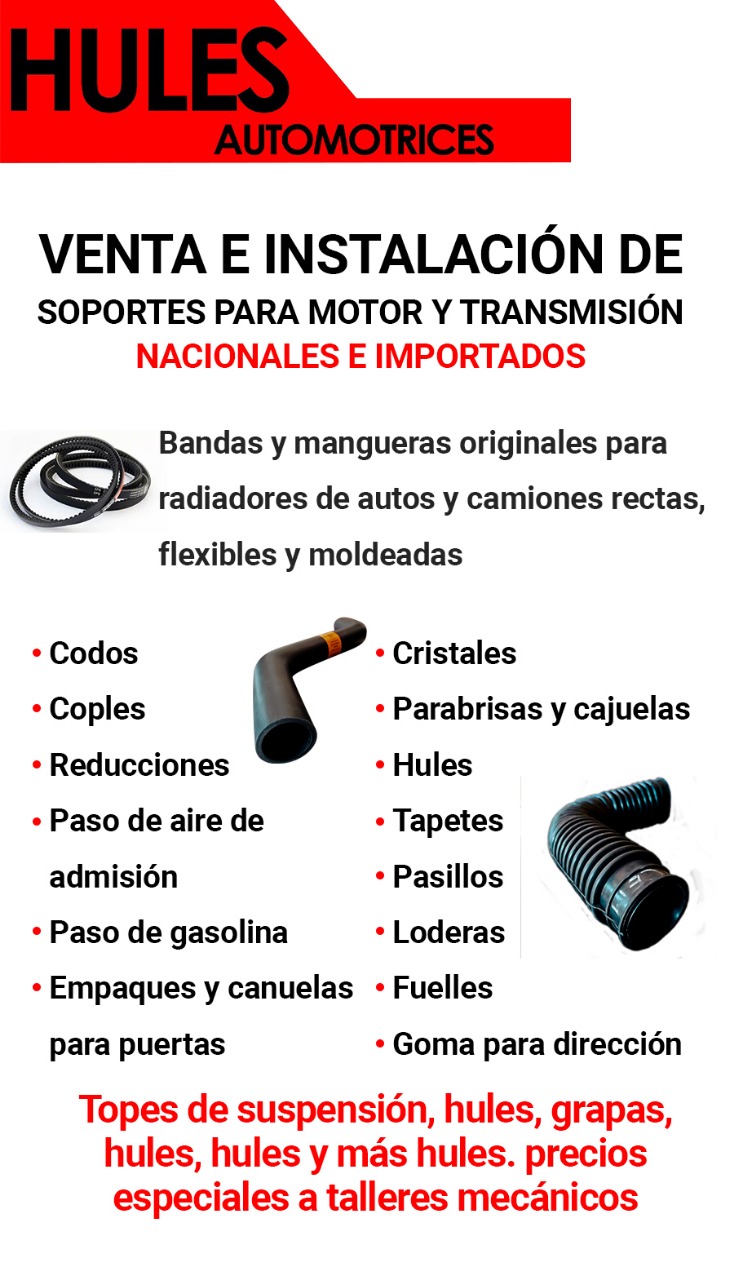 Te ofrecemos Venta e Instalación de soportes para motor y transmisión Nacionales e Importados. Bandas y mangueras originales para radiadores de autos y camiones, Rectas, flexibles y moldeadas. Hules, hules y mas hules... !PRECIOS ESPECIALES A TALLERES MECANICOS!