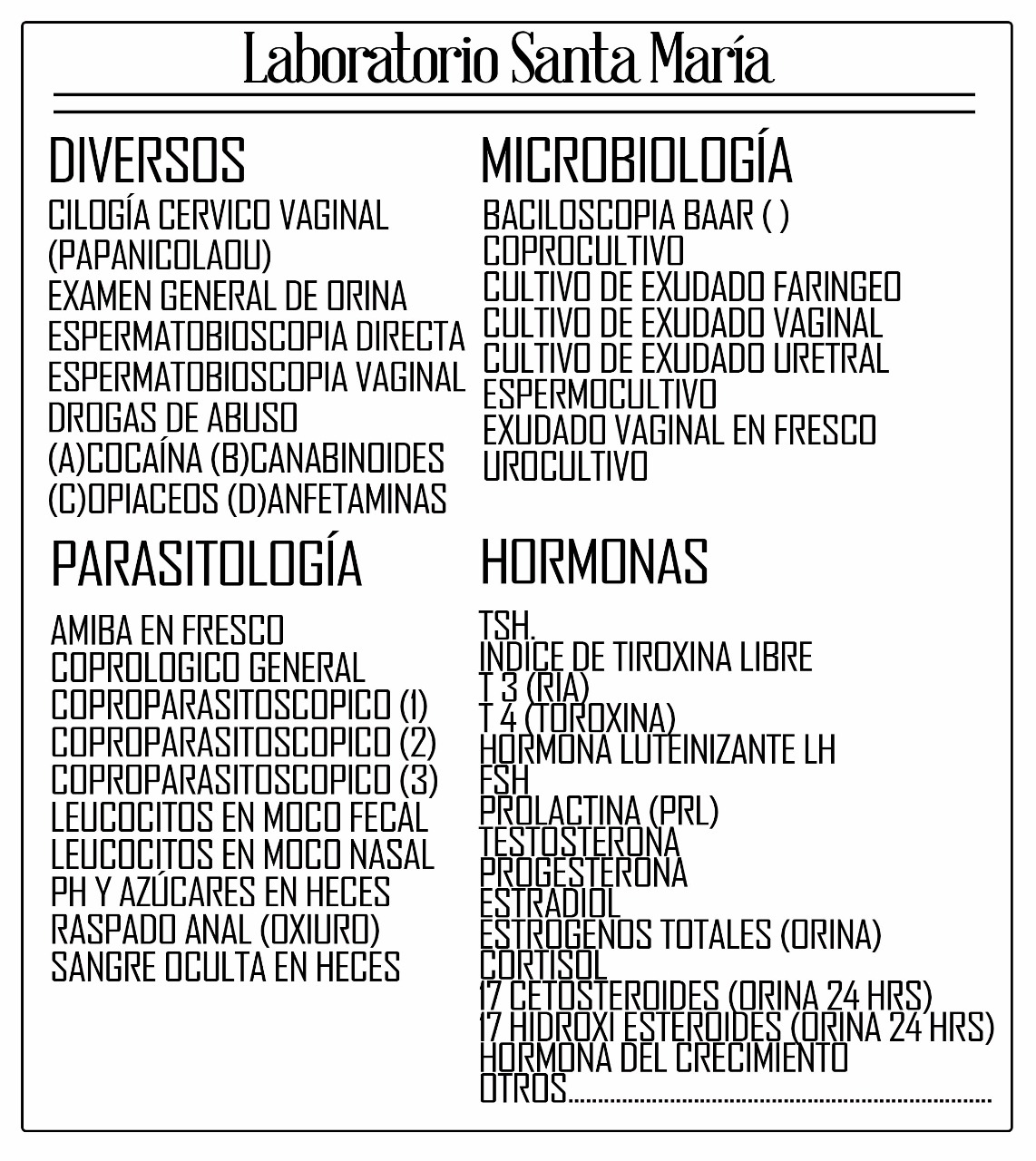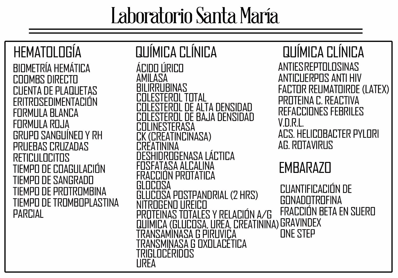 Laboratorio Santa Maria es un laboratorio privado que labora desde 1982, asiste a pacientes que acuden a sus análisis de rutina y además da atención a empresas e instituciones que requieren un chequeo de su personal para el buen desempeño de funciones en su trabajo, somos tres químicas que laboran en las áreas de química clínica, serologia, hematologia, un administrativo además de la persona de servicio de limpieza. Disponemos de servicios permanentes de tomas a domicilio.