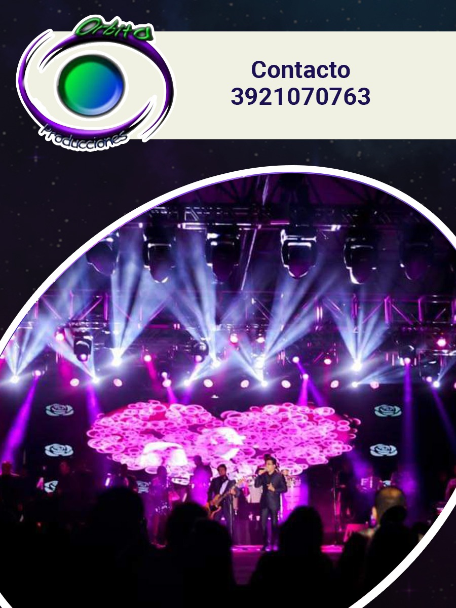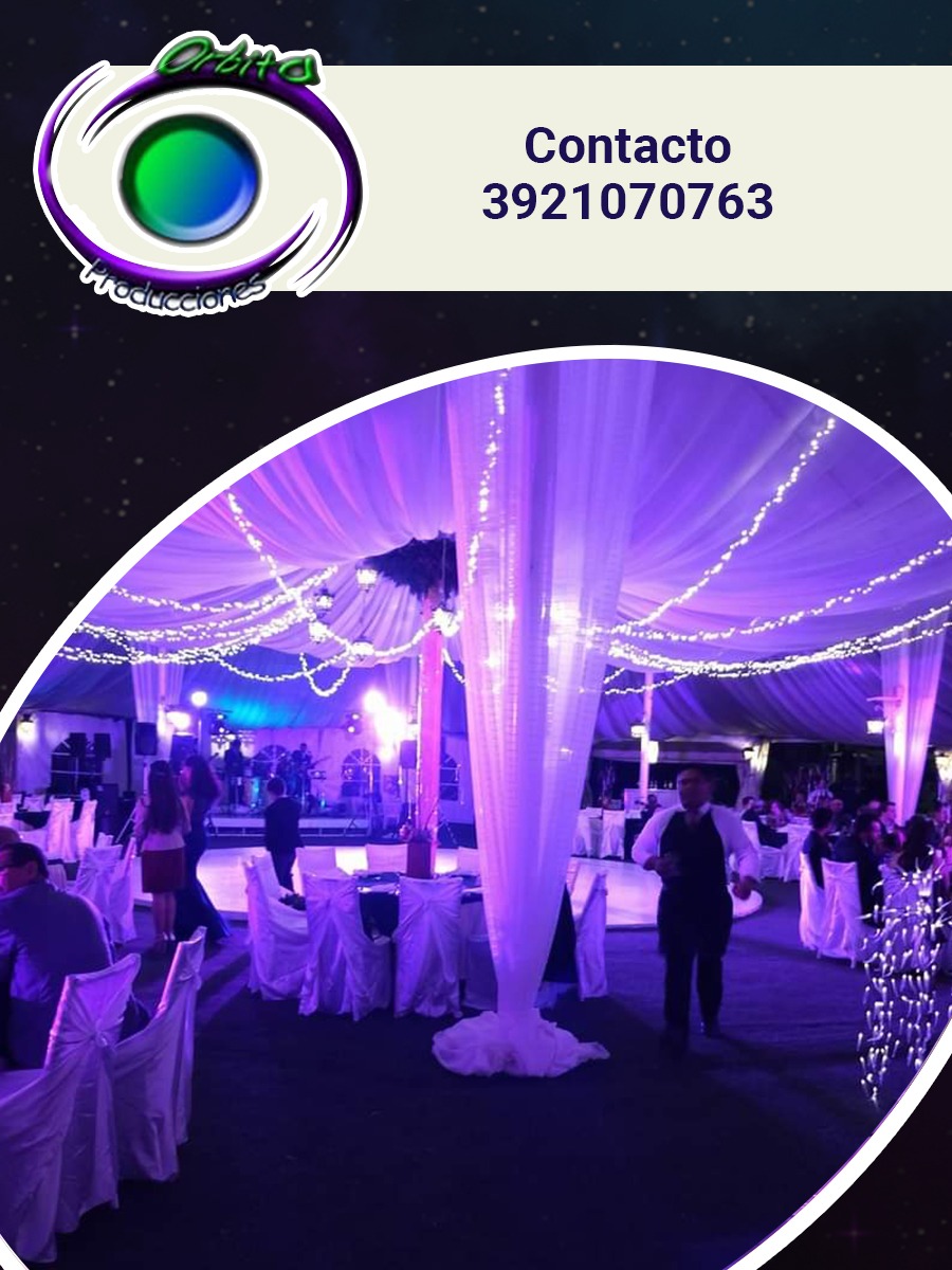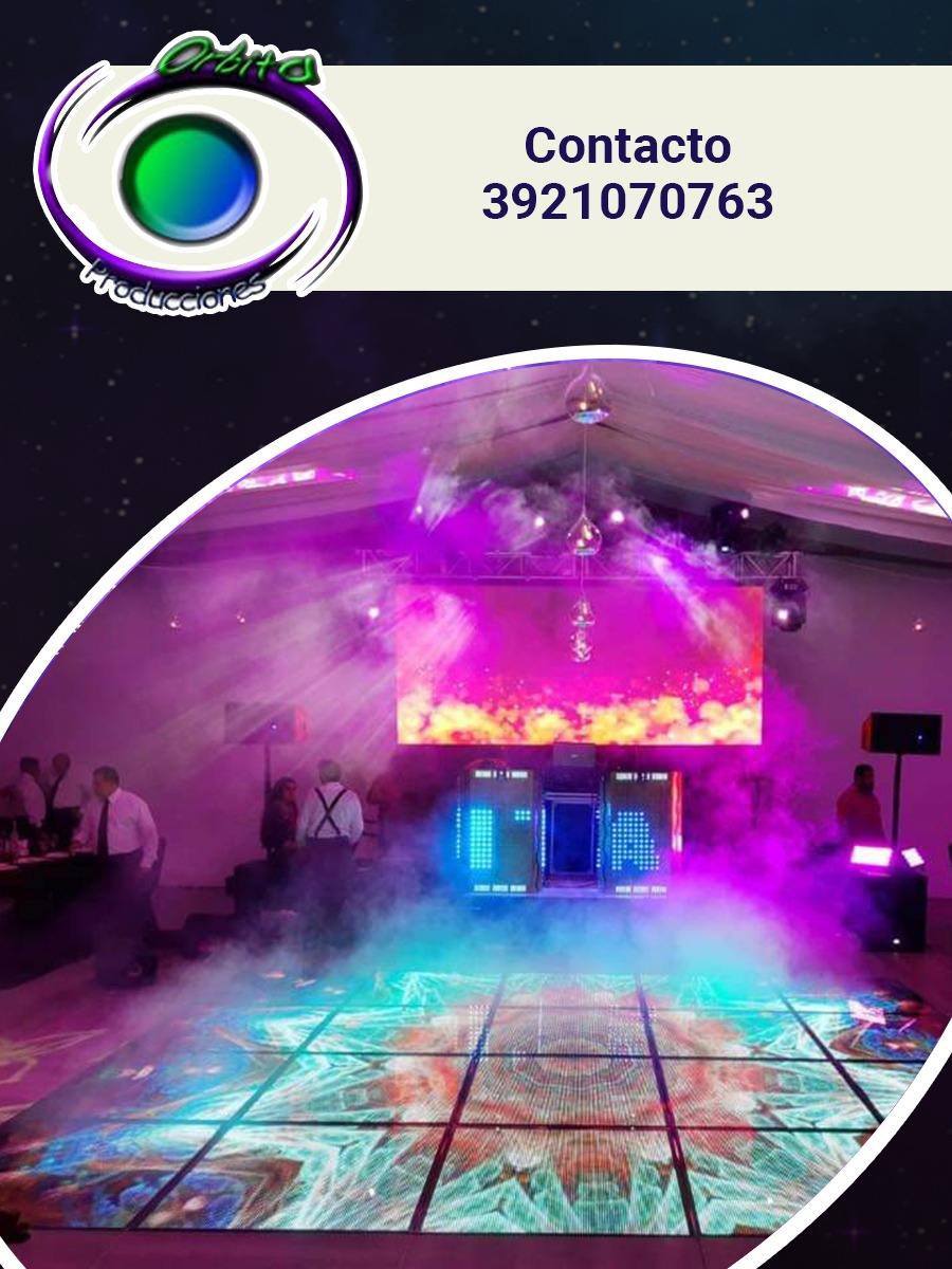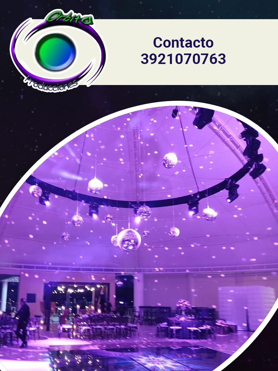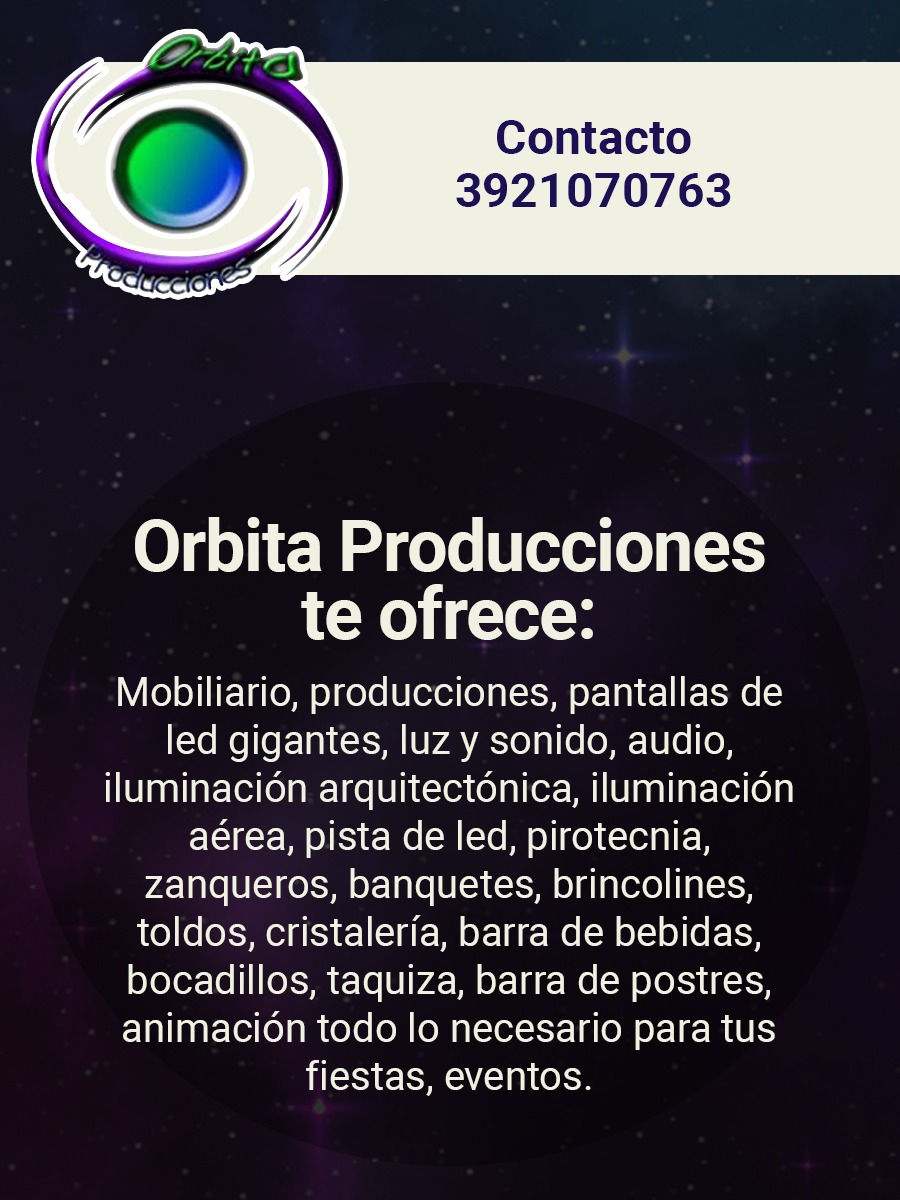 Orbita Producciones te ofrece; mobiliario, producciones, pantallas de led gigantes, luz y sonido, audio, iluminación arquitectonica, iluminación aérea, pista de led, pirotecnia, sanqueros, banquetes, brincolines, toldos, cristaleria, barra de bebidas, bocadillos, taquiza, barra de postres, animación todo lo necesario para tus fiestas, eventos.