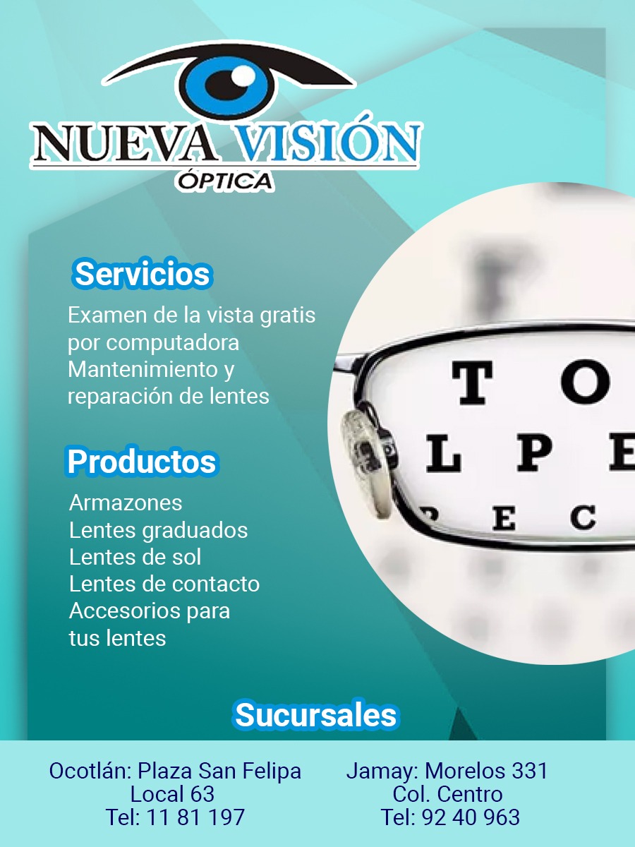 Optica Nueva Vision te ofrece Examen de la vista por computadora Gratis, Lente Graduado (Oftalmico), Lentes de Contacto, Lentes de Sol.