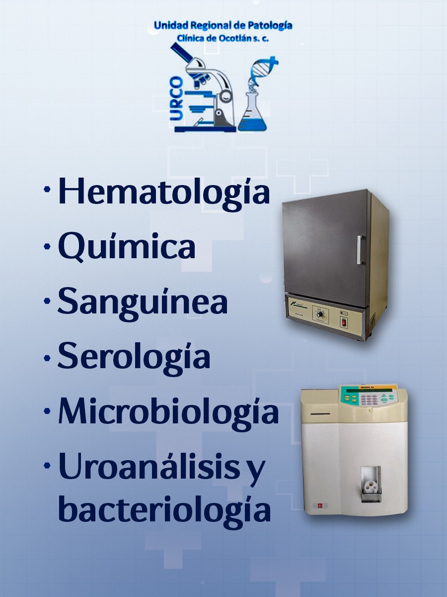 Unidad Regional de Patología Clínica de Ocotlán S.C. te ofrece Hematologia, Analisis clinicos, quimica sanguinea, serologia, inmunologia, hormonas, urianalisis, examenes varios, papanicolao.